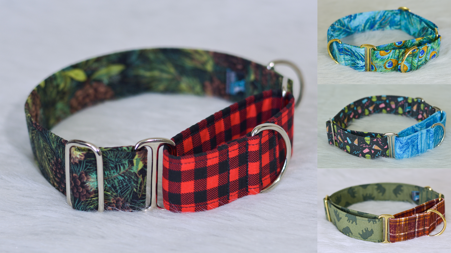Did you know we offer "two toned" fabric martingales? Two patterns for the price of one! - To order a two toned martingale, simply choose the collar you want for the main part (the adjustable side), select fabric martingale in your choice of hardware, and then in that nifty notes box, just let us know if you'd like a different fabric for the martingale loop of you collar! It's really that easy, but if you have any issues feel free to message us!
