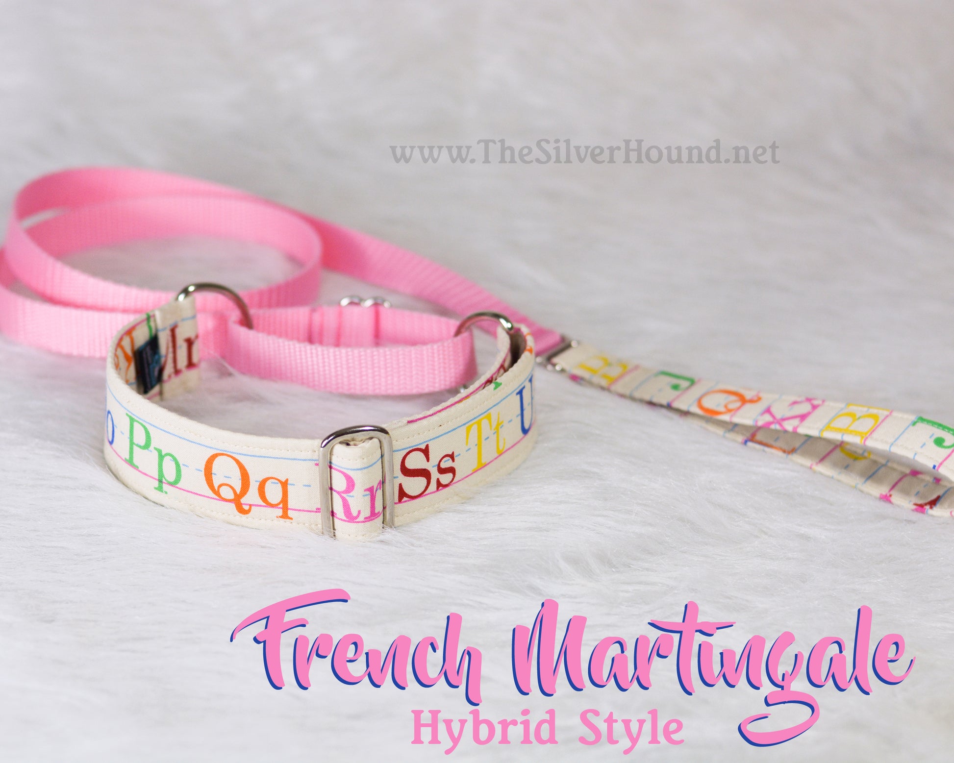 This listing is for a hybrid French martingale / slip martingale. The term hybrid refers to the use of two materials: the fabric leash handle and fabric collar paired with a webbing leash. (Webbing is always either polypropylene or polyester - we do NOT use nylon webbing unless custom ordered.)