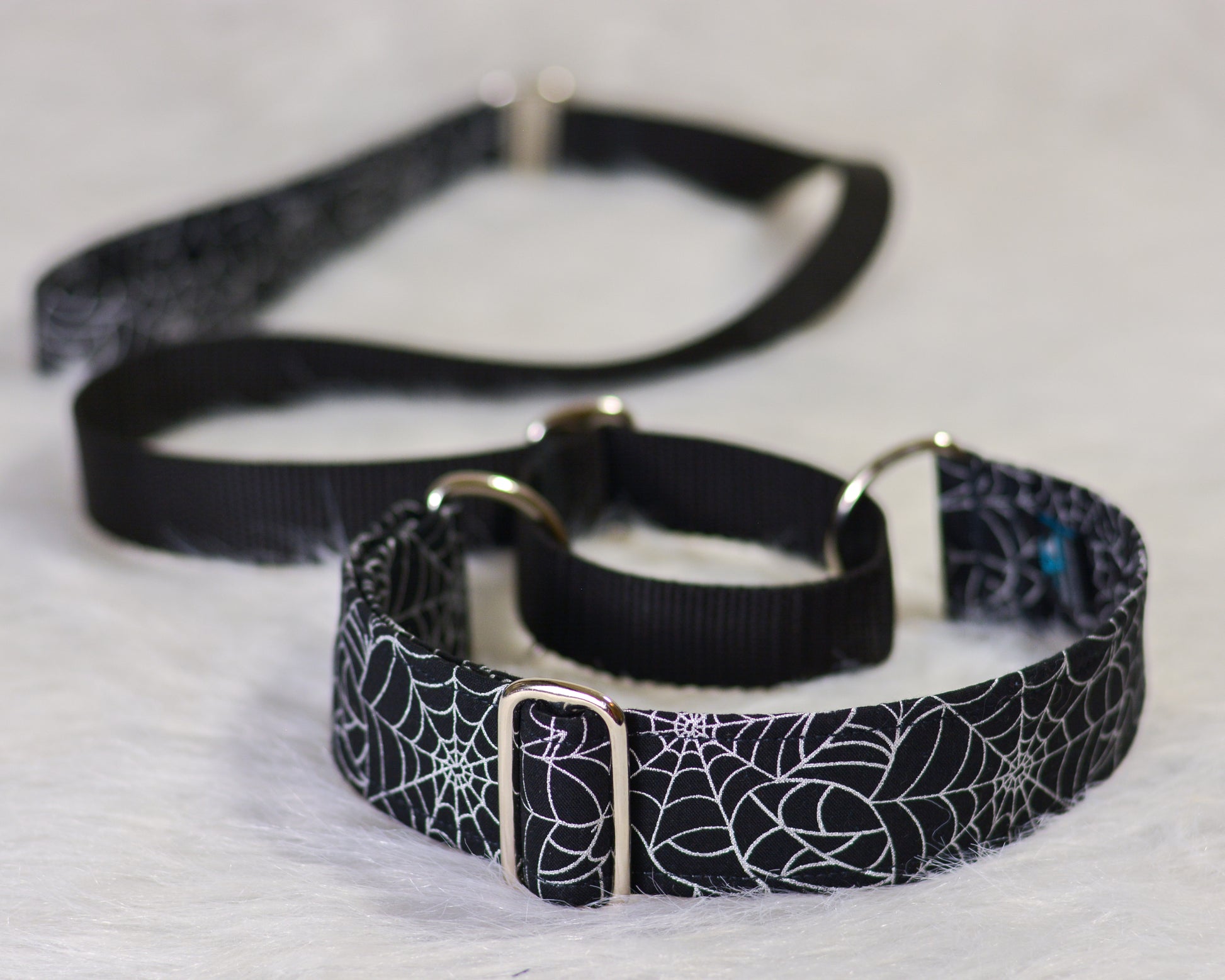 Custom made to your specifications! Choose your leash width (3/4" or 1" wide), your collar width (3/4" - 2"), your hardware (Silver, Brass, or Rainbow), your leash length (up to 6 feet included, custom sizes available by custom order), your fabric (pick from any of our collar listings for our fabric selection), and your webbing color (see the color chart below, some photo examples are discontinued colors). The leash length is the entire length of the leash (including the handle) not including the collar. The handle is about an 8" loop.