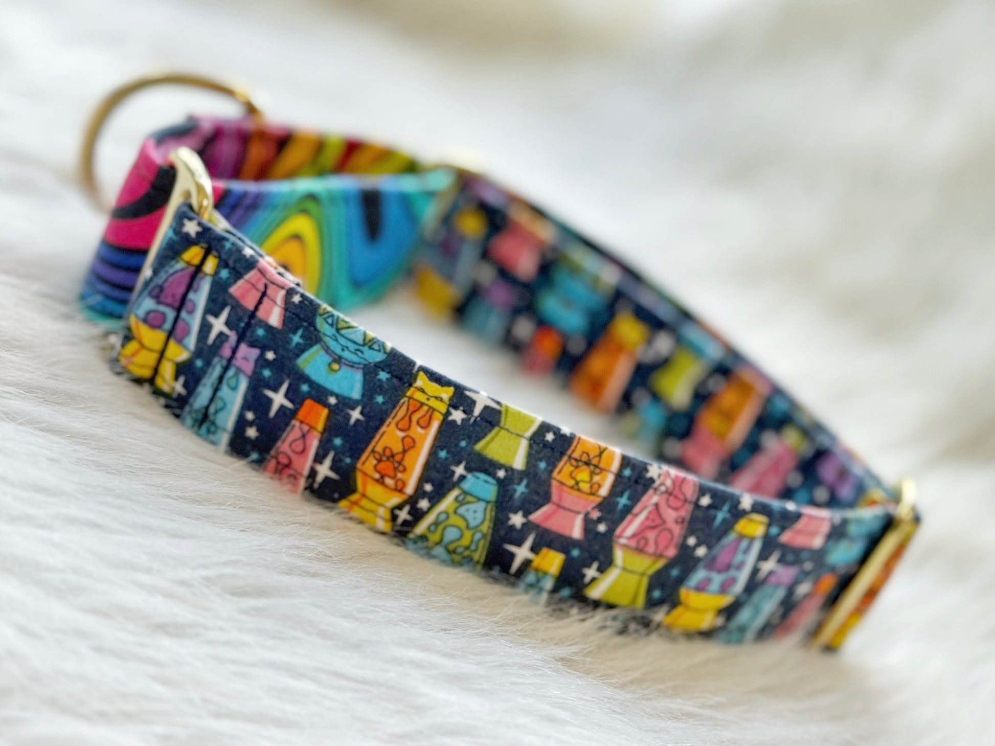 You can order a made to order collar of it here: Main part of the collar is this fabric: Lava Lamp Cats Fabric & The loop is made out of this fabric: The Harvey Collar