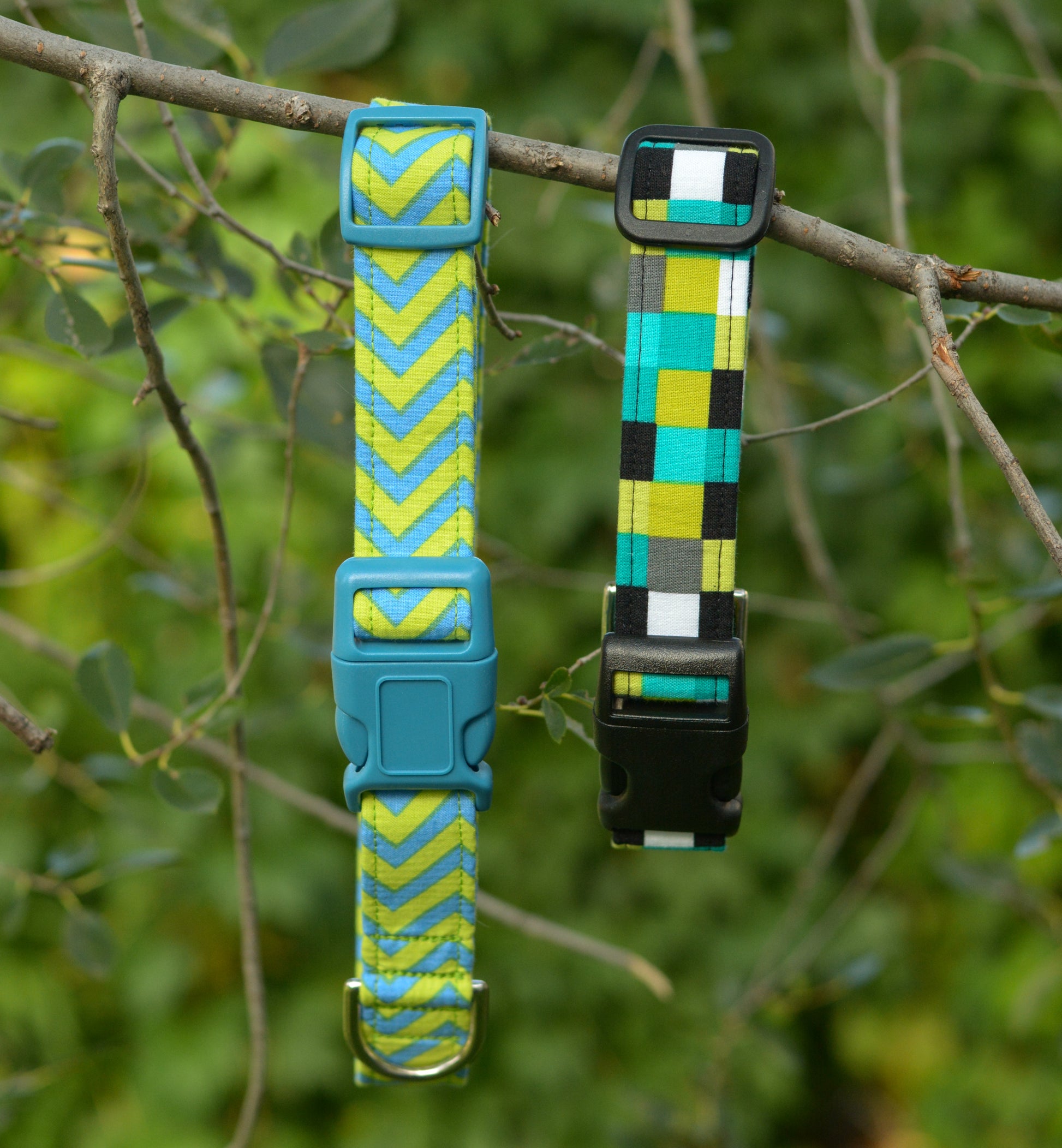 Collar Care: I personally toss my collar in the washer on cold and lay it flat to dry or hang it outside on a nice day (not in direct sun - this can cause fading)! If you have a collar with a lot of metal hardware, it's recommended to place the collar in a garment bag (or tie it inside a pillowcase). If your collar seems wrinkled, you can very carefully and quickly go over it with an iron on a low-medium setting (being very careful to avoid the hardware, especially if it's plastic). This is to be done carefully, as you don't want to melt or warp the interior webbing!